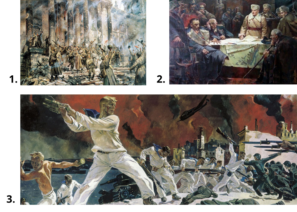 В СССР распространённым явлением был выпуск почтовых марок, отражавших важные события эпохи (достижения, победы и прочее). Восстанови хронологию известных событий, представленных на изображениях ниже, согласно дате их окончания, начиная с самого раннего. Полученная комбинация цифр (цифры представлены в кружках на изображениях событий) будет обозначать число, месяц (по юлианскому календарю) и последние две цифры года, одного из знаковых событий в истории российской авиации. Определи, что это за событие, и назови имя собственное, которое присутствовало в названии машины, непосредственно связанной с этим событием. В ответе запиши только это имя одним словом, без кавычек, без пробелов, без каких-либо знаков препинания.