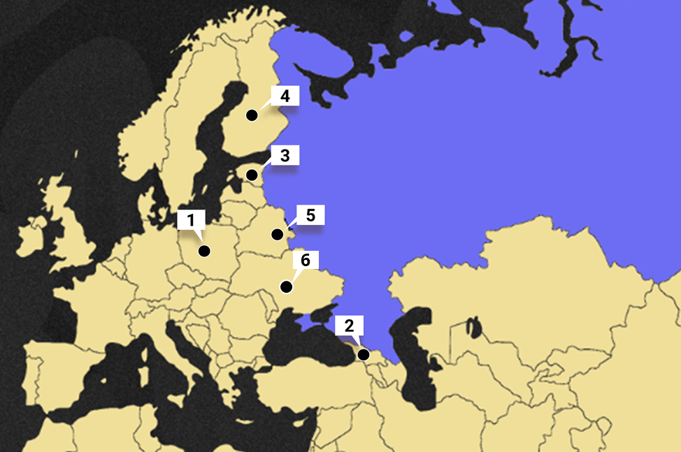 На карте цифрами отмечены: 1. Польша 2. Грузия 3. Эстония