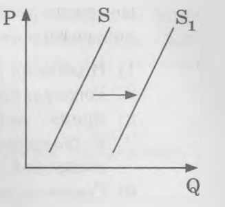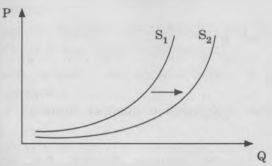 На графике изображено изменение предложения коньков для фигурного катания на потребительском рынке: кривая предложения S1 переместилась в положение S2. (На графике Р — цена товара, Q — количество товара.)