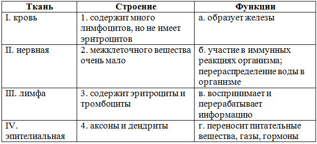Рассмотрите таблицу и установите соответствие между названием, строением и функциями тканей.