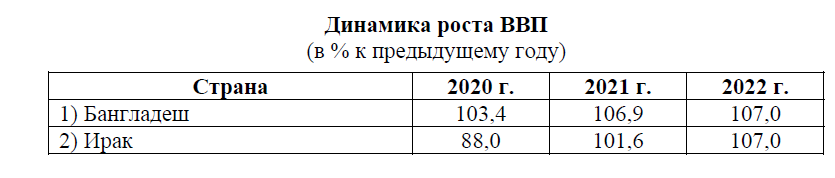 На уроке учащиеся анализировали статистические данные, приведённые ниже в таблице,в целях сравнения темпов роста ВВП в Бангладеш и Ираке в период с 2020 по 2022 г.