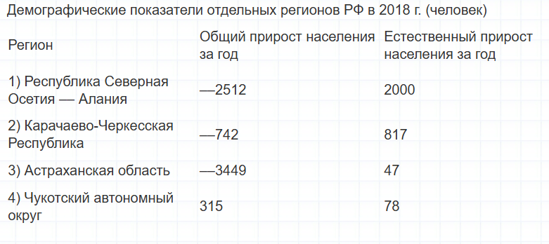 На численность населения стран влияние оказывают как естественное движение населения,так и миграции. Используя данные таблицы, определите величину миграционного прироста в Чукотском автономном округе в 2018 г. Ответ запишите в виде числа.