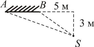 На рисунке изображены плоское зеркало АВ и точечный источник света S. Чему равно расстояние от источника света S до его изображения в зеркале АВ? Ответ выразить в м.