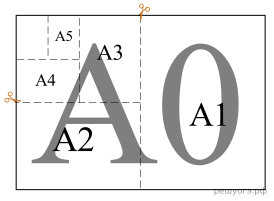 Общепринятые форматы листов бумаги обозначают буквой А и цифрой: А0, А1, А2 и так далее. Лист формата А0 имеет форму прямоугольника, площадь которого равна 1 кв. м. Если лист формата А0 разрезать пополам параллельно меньшей стороне, получается два равных листа формата А1. Если лист А1 разрезать так же пополам, получается два листа формата А2.