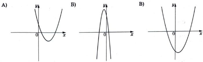 На рисунках изображены графики функций вида у = ах2 + bх + c. Установите соответствие между графиками функций и знаками коэффициентов а и с.
