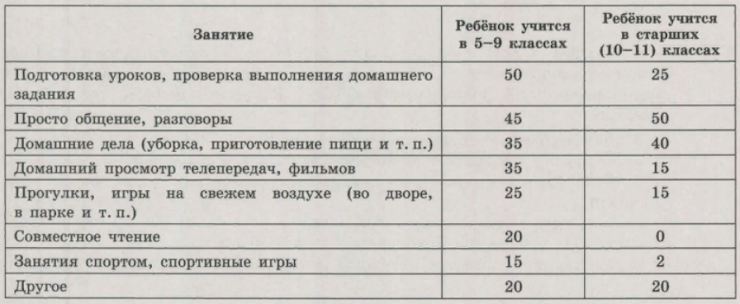 - Среди родителей обучающихся в старших классах домашние дела как совместное занятие с ребёнком в будние дни более популярны, чем занятия спортом, спортивные игры.