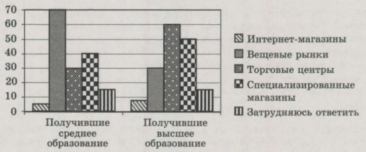 В ходе социологического опроса совершеннолетним гражданам, имеющим разный уровень образования, задавали вопрос: «Где Вы, как правило, покупаете одежду и обувь?» (Можно было выбрать не более двух ответов.) Полученные результаты (в % от числа опрошенных) представлены в графическом виде. Найдите в приведённом списке выводы, которые можно сделать на основе диаграммы, и запишите цифры, под которыми они указаны.