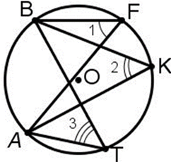 Градусная мера дуги АВ равна 100°. Найдите сумму углов AFB, AKB и ATB.