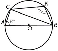 Точка О – центр окружности, АВ – диаметр. Угол САВ равен 70°. Найдите градусную меру угла ВКС.