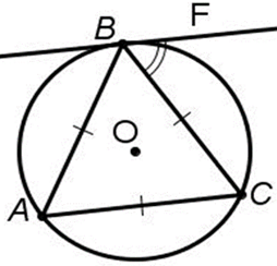 △АВС – равносторонний, О – центр окружности, прямая BF касается окружности в точке В. Найдите градусную меру угла СВF. В ответ запишите только число без единиц измерения.