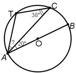 Точка О – центр окружности, АВ – диаметр. ∠ТСА = 38°, ∠САВ = 20°. Найдите градусную меру угла ТАС. В ответ запишите число без единиц измерения.