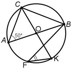 Точка О – центр окружности, АВ – диаметр, угол САВ равен 50°. Найдите градусную меру угла BFK. В ответ запишите число без единиц измерения.