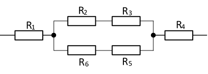 Каршылыктары R1 = R2 = R3 = R4 = R5 = R6 = 1 Ом болгон өткөргүчтөр чынжырда сүрөттө көрсөтүлгөндөй схемада туташтырылса, анда бул өткөргүчтөрдүн жалпы каршылыгын тапкыла.