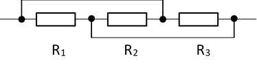 Чынжырдын жалпы электрдик каршылыгын аныктагыла. Анын схемасы сүрөттө көрсөтүлгөн. Мында R1 = R2 = R3 = 2 Ом.