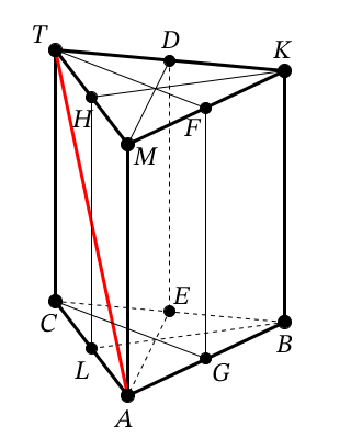 Дана правильная треугольная призма. Найти угол между TA и плоскостью AMK