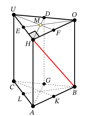 Дана треугольная призма UH=HO? M - точка пересечения медиан. Найти угол между HB и плоскостью CUH