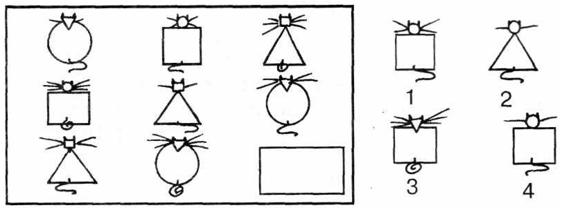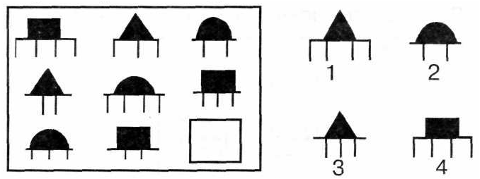 Выбери фигуру из четырёх пронумерованных, которую нужно вставить в пустой квадратик.