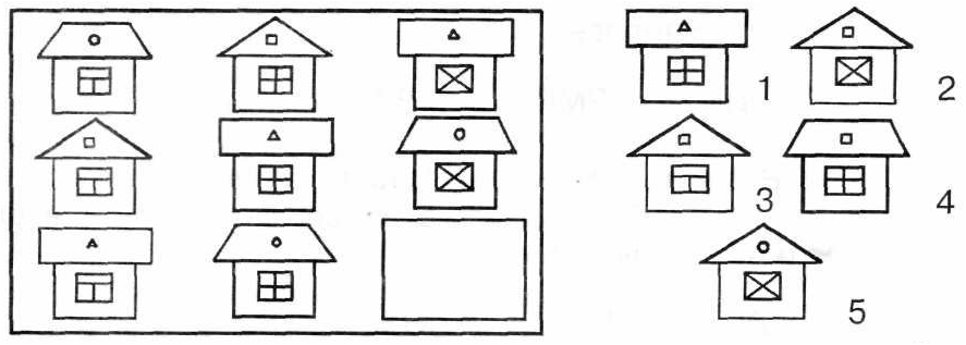 Выбери фигуру из пяти пронумерованных, которую нужно вставить в пустой квадратик.