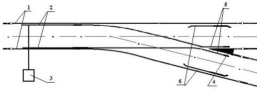 - 1-рамные рельсы; 2-остряки; 3-переводной механизм; 4-сердечник; 5-усовики; 6-контррельсы