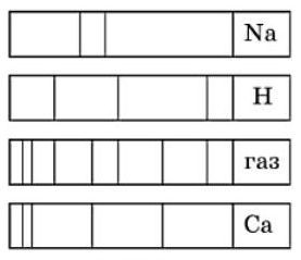 На рисунке изображены фотографии спектров поглощения Na, H, Ca и неизвестного газа. По виду спектров можно утверждать, что неизвестный газ содержит в заметном количестве