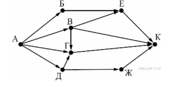 Задача. На рисунке — схема дорог, связывающих города А, Б, В, Г, Д, Е, Ж и К. По каждой дороге можно двигаться только в одном направлении, указанном стрелкой. Сколько существует различных путей из города А в город К?