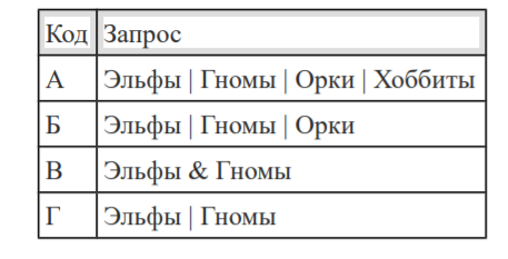 Задача. В таблице приведены запросы к поисковому серверу. Для каждого запроса указан его код — соответствующая буква от А до Г. Расположите коды запросов слева направо в порядке возрастания количества страниц, которые нашёл поисковый сервер по каждому запросу. По всем запросам было найдено разное количество страниц. Для обозначения логической операции «ИЛИ» в запросе используется символ «|», а для логической операции «И» — «&»: