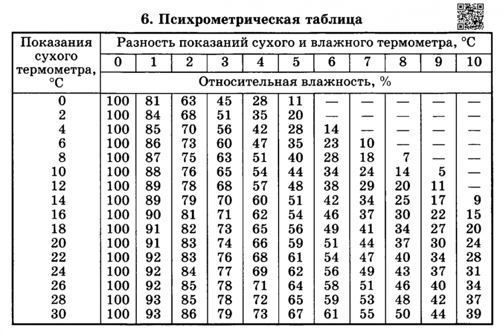 1. Используя психрометрическую таблицу и показания термометров, входящих в состав психрометра, установленного в некотором помещении, определи относительную влажность воздуха (в \%) в этом помещении.