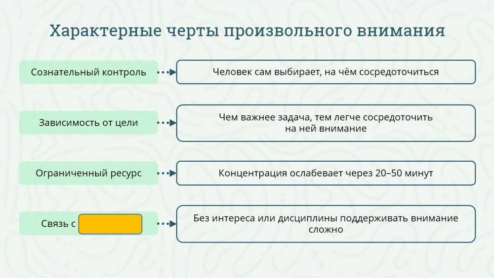 Это сознательная концентрация на объекте или задаче, требующая волевых усилий