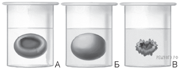 В стеклянные стаканы, заполненные растворами поваренной соли различной концентрации, поместили эритроциты. Рассмотрите рисунки и определите по внешнему виду эритроцита концентрацию раствора в сосуде А, если в крови в норме она составляет 0,9%.