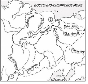 Какие элементы реки Колымы обозначены на картосхеме цифрами 1-4? Поставьте цифру около соответствующего элемента (слова)
