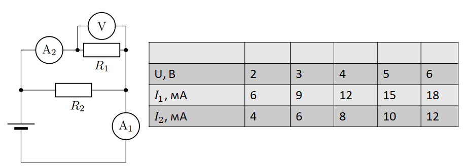 Полученные значения вносят в таблицу. Исходя из данных таблицы определите сопротивление второго резистора. Ответ дайте в Омах.