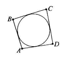 На рисунке четырехугольник ABCD описан около окружности. Это значит, что его стороны обладают следующим замечательным свойством: