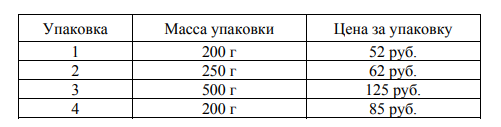 В магазине продаётся несколько видов творога в различных упаковках и по различной цене. В таблице показана масса каждой упаковки и её цена. Какова наименьшая цена за килограмм творога?