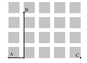 Найдите длину пути от точки А до точки В, изображённых на плане.