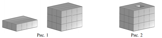 Из одинаковых кубиков сложили фигуру, а затем положили на неё сверху ещё две такие же фигуры из кубиков (рис. 1). После этого сверху вытащили ровно один кубик (рис. 2).