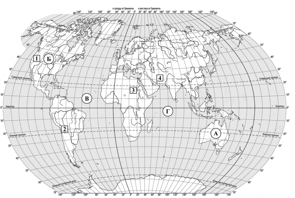Соотнесите названия материков и океанов и букву, гляда на карту ниже: