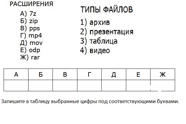Установите соответствие между расширениями и типами файлов: для каждой позиции первого столбца, обозначенной буквами, подберите соответствующую позицию из второго столбца, обозначенную цифрой.