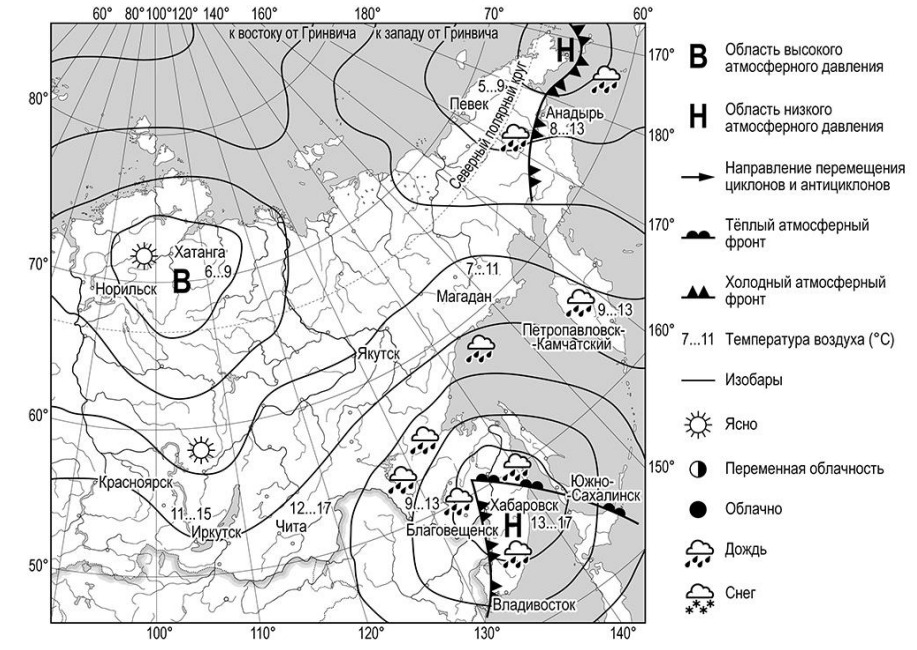 Алексей из Читы прослушал прогноз погоды по радио: «Завтра, 5 сентября, ожидается похолодание, в дневные часы температура воздуха опустится до 9 градусов по Цельсию, ночью – до 5 градусов, пройдут дожди, будет облачно, без прояснений», но не услышал, для его ли города этот прогноз был составлен. С помощью карты определите, для какого из показанных на карте городов был составлен этот прогноз. Запишите название города в именительном падеже