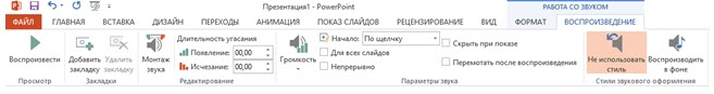 Введите название раздела во вкладке "Воспроизведение", с помощью которого можно установить непрерывное воспроизведение звука на всех слайдах.