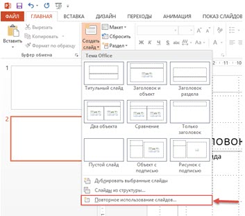 - Этот пункт позволяет использовать слайды из шаблонов.
