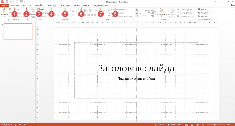На рисунке представлен интерфейс программы Microsoft PowerPoint. Укажите номер вкладки, с помощью которой можно выбрать оформление слайдов для всей презентации.