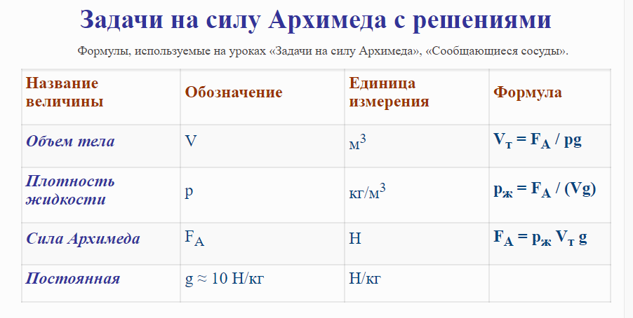 Выталкивающая сила. Закон Архимеда. Формула силы Архимеда.