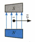 Положительно заряженная частица, имеющая горизонтально направленную скорость \(\vec{v}\), влетает в область поля перпендикулярно магнитным линиям (см. рис.). Куда направлена действующая на частицу сила?