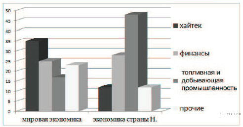 Аналитический центр Министерства экономического развития страны Н. провёл сравнительное исследование структуры мировой экономики и экономики национальной. В фокусе внимания исследователей было выявление доли различных отраслей в структуре обеих экономик.