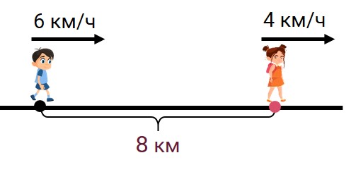 Из двух посёлков, расстояние между которыми 8 км, одновременно в одном направлении вышли два пешехода. Скорость пешехода, идущего впереди, 4 км/ч, а скорость пешехода, идущего позади, 6 км/ч. Через сколько часов после выхода второй пешеход догонит первого?