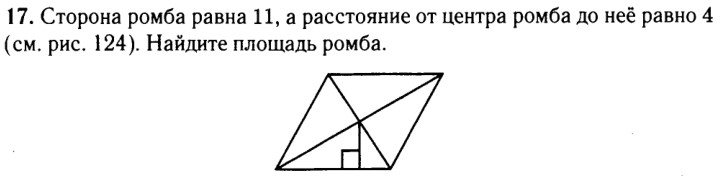 - Площадь ромба равна произведению его стороны на высоту, проведѐнную к этой стороне.