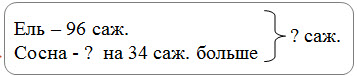 - В лесничестве было высажено 96 саженцев ели. Их посадили на 34 саженца меньше, чем саженцев сосны. Сколько всего саженцев хвойных деревьев было высажено в лесничестве?