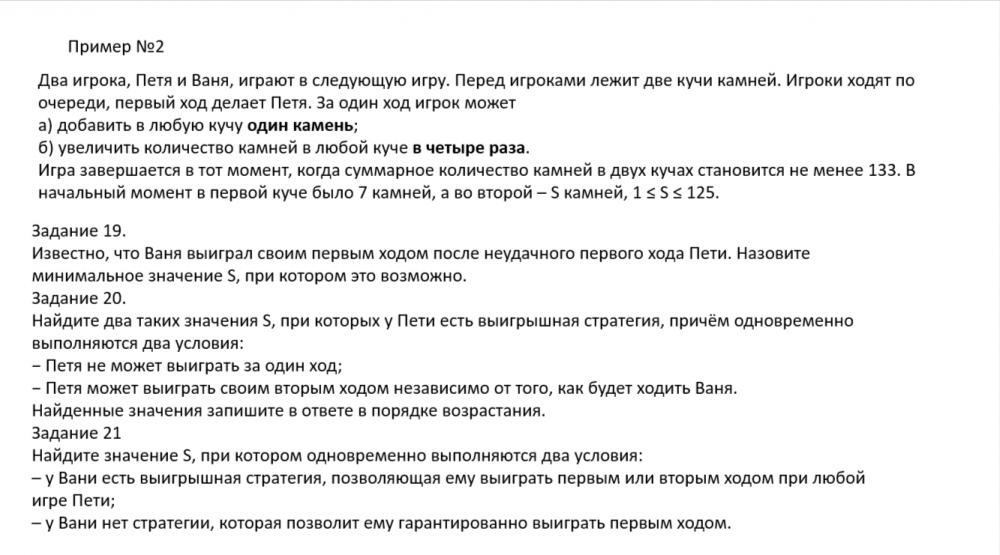 Решение заданий 19-21 по информатике основано на знании теории игр, проверяемым элементом содержания является умение построить дерево игры по заданному алгоритму и обосновать выигрышную стратегию. Решить задание можно любым способом (аналитический, программный, с помощью Ексель). Примерное время на выполнение – 30 минут.