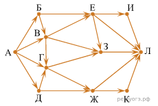 На рисунке — схема дорог, связывающих города А, Б, В, Г, Д, Е, Ж, З, И, К и Л. По каждой дороге можно двигаться только в одном направлении, указанном стрелкой. Сколько существует различных путей из города А в город Л, проходящих через город B?