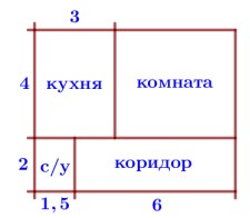 Квартира состоит из комнаты, кухни, коридора и санузла (смотрите чертёж). Кухня имеет размеры 3 м × 4 м, санузел – 1,5 м × 2 м,
